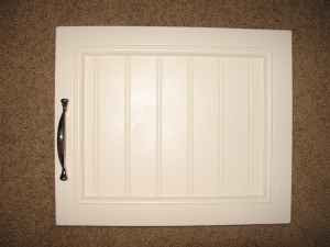 I am so proud of myself. I just finished remodeling our kitchen cabinets for our cabin and can't wait to put them in. Of course I didnt take a before picture for whatever reason but please believe me when I say these were butt-ugly. They were red with a flat panel in the middle and a ugly handle in the middle of that panel (who puts handles in the middle of a cabinet?). I kicked out the middle panel, sanded, cut the beadboard, glued / nailed in the beadboard, calked, primed, and painted, then put the handle pulls on the end of the cabinet where they belong. All on my own, with the direction of my wonderful hubby, and with power tools! I feel so crafty and they actually turned out great (or at least 1000 times better than they did before).